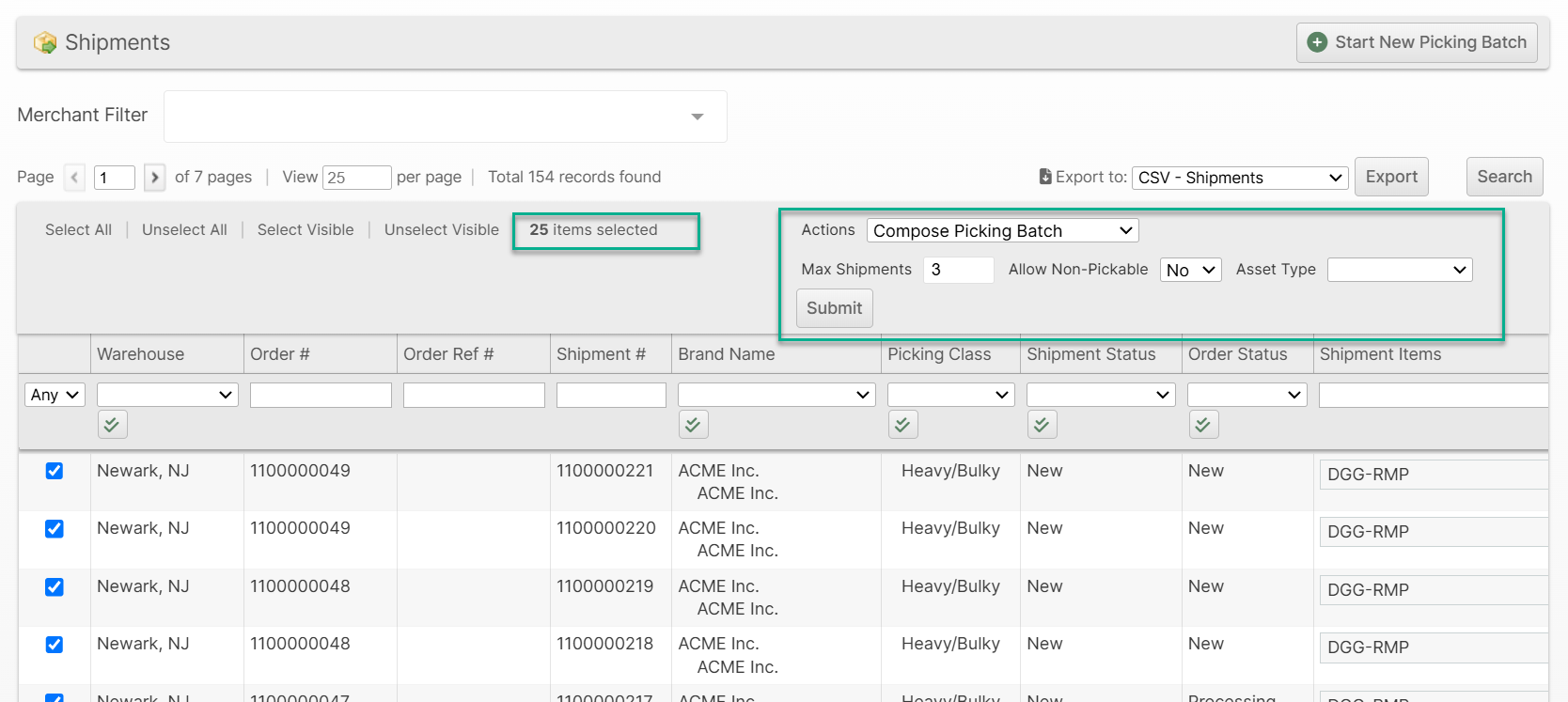Although batches can be "force composed" using any shipments belonging to the same warehouse via a mass action on the Orders or Shipments grids, the recommended method (Compose Batch mass action or Create new Picking Batch dialog) allows ShipStream to compose the batch considering all shipments in your warehouse (segregated by Picking Class and usually Target Ship Date but possibly many other criteria) to optimize the picks into clusters of the same or nearby pick locations.