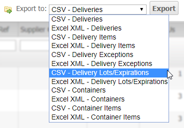 From the Receiving grids, ASNs, RMA, Cancellations, and Other Shipments, you can export out the Delivery Lots/Expirations as CSV or Excel XML files.