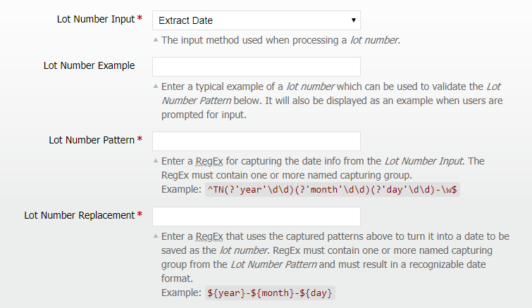 - Lot Number Example — (The same use as for Extract Date) Used to enter in a typical example of the Lot Number used on the product(s). This can then be used to validate the Lot Number Pattern below and can be displayed to users when they are prompted to input a Lot Number.