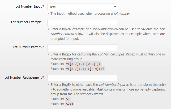 - Lot Number Example — Used to enter in a typical example of the lot number used on the product(s). This will be used to validate the Lot Number Pattern below and displayed to users when prompted to input a lot number.