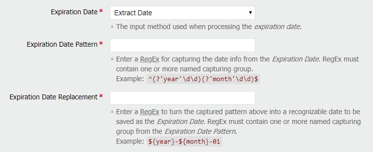 - Expiration Date Replacement — Used to enter a RegEx that is used to turn the captured pattern above into a recognizable date that is saved as the Expiration Date.
