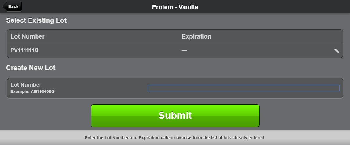 - Text — A text entry field to enter the lot number