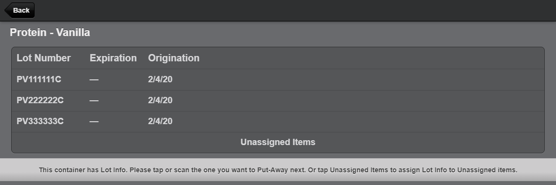 Put-away will remain the same until the user begins put-away on a product with a Lot Type. Once the user scans the product they will be shown a list of all the lots processed for this delivery. The user will tap a lot to go to the location selection page which will display some new information.