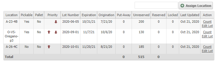- Rows sorted by the lot that expires the soonest and locations with no lot info are last