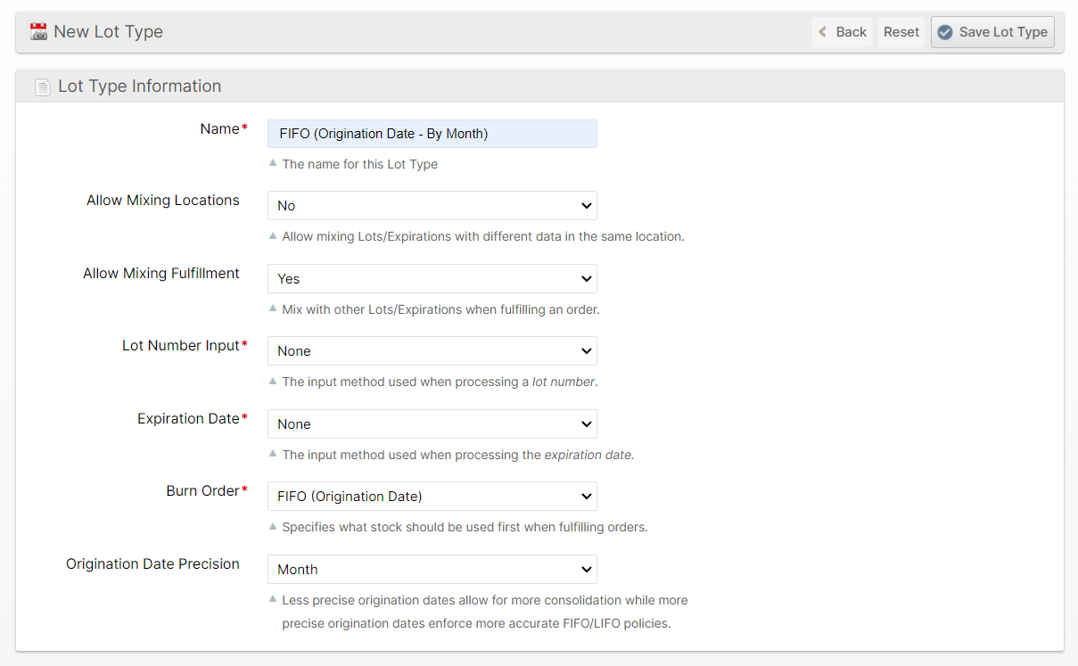The simplest Lot Type can have no "inputs" as depicted below, but this will still ensure that the Origination Date is assigned to all received inventory going forward. If you choose to have Lot Number or Expiration Date inputs, these will be captured during Processing, Cycle Count or Relocation. You can also import lot numbers and expiration dates if you already have this information using the Location Import tool.