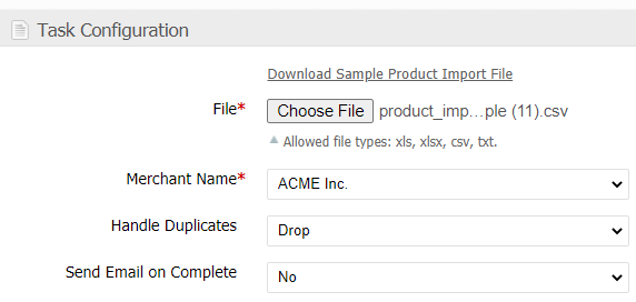 If your import file includes Packaging Features such as valid_containers, special_supplies, or special_other columns, then the "Merchant" field must match the merchant assigned to the packaging features.- If you would like to import a file and ignore (or drop) duplicate products during the process, then select "Drop" as the method for Handle Duplicates. Otherwise, if you would like the Import Task to stop (or break) upon reaching a duplicate product, choose "Break".