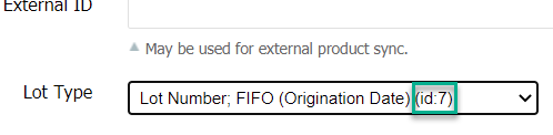 | lot_type_id | The "Lot Type" attribute. This number corresponds to the "Lot Type" which is user-created in Catalog > Lot Types. Admins - The Lot Type IDs can be found in the Catalog > Lot Types grid view, in the ID column. Clients - Open the Lot Type drop-down menu in the Product view. ![]() | 7 |