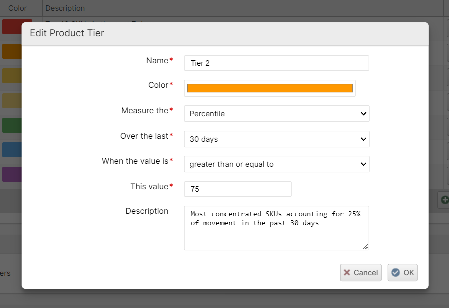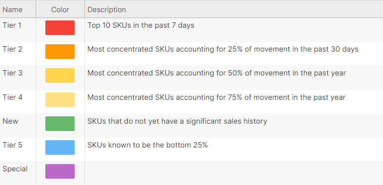 Rather than leave that up to interpretation, you want to simplify the problem down to a more comprehensible size and also ensure that everyone uses a common dialect that is objective. To this end, ShipStream enables you to automatically assign each product in each warehouse to a predefined Product Tier that your team members can all easily understand and communicate.