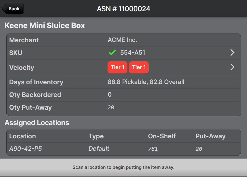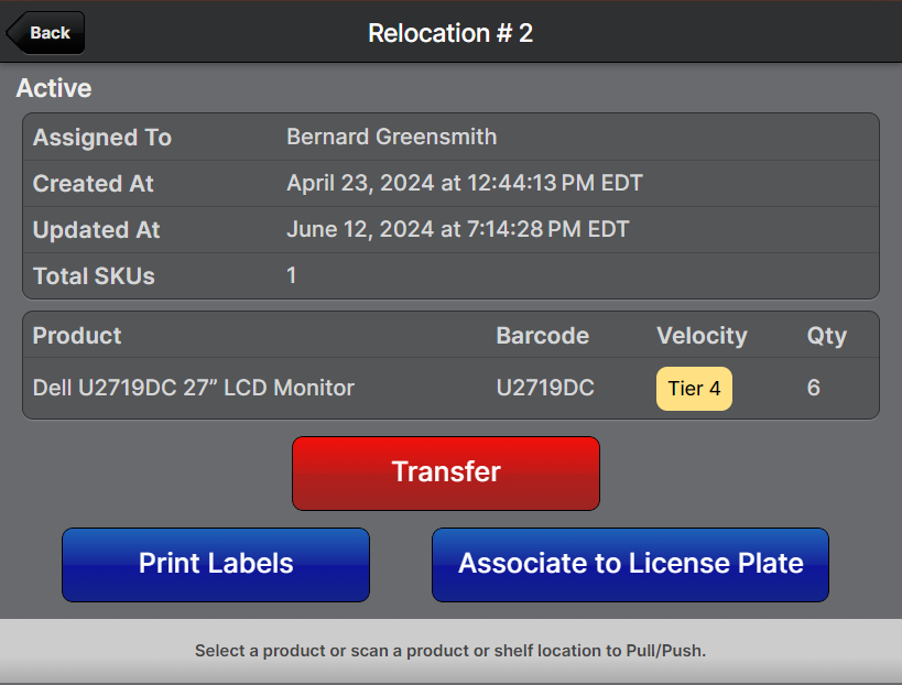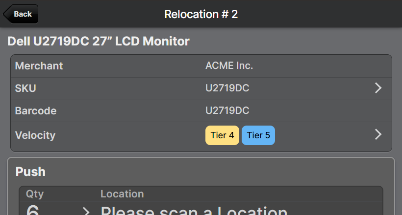 After scanning a product to relocate, you can see the Pickable and Overall velocity: