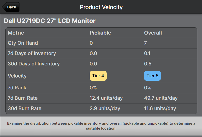 On the individual item page, both the Pickable and Overall velocity is displayed as well as the Days of Inventory: