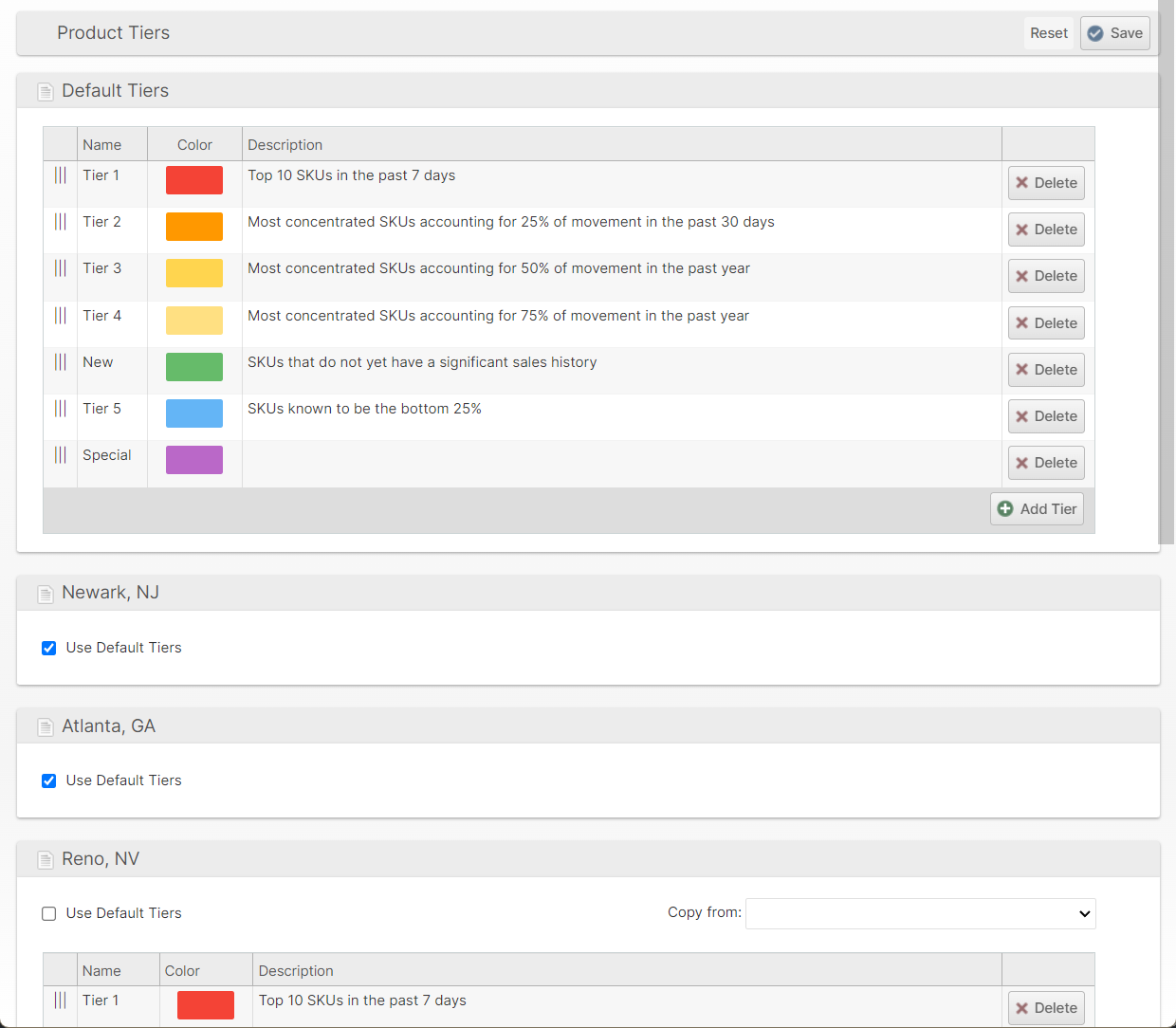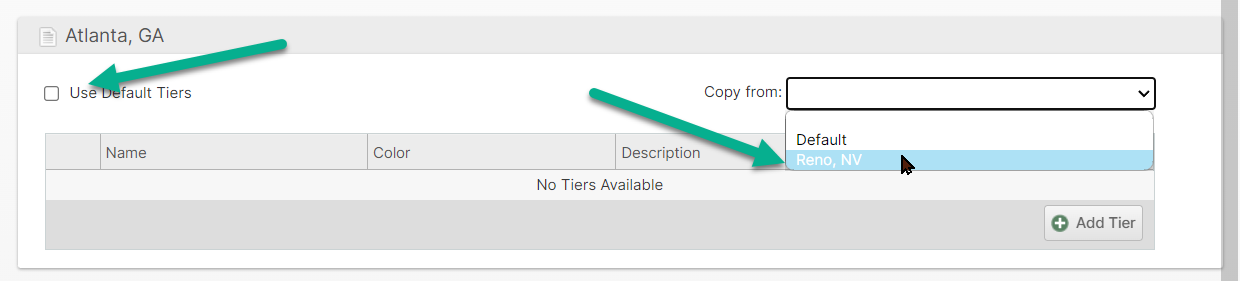 Uncheck Use Default Tiers to override the tiers for a specific warehouse. Choose Copy from and select a source then click Save to copy the tiers from one warehouse to another.