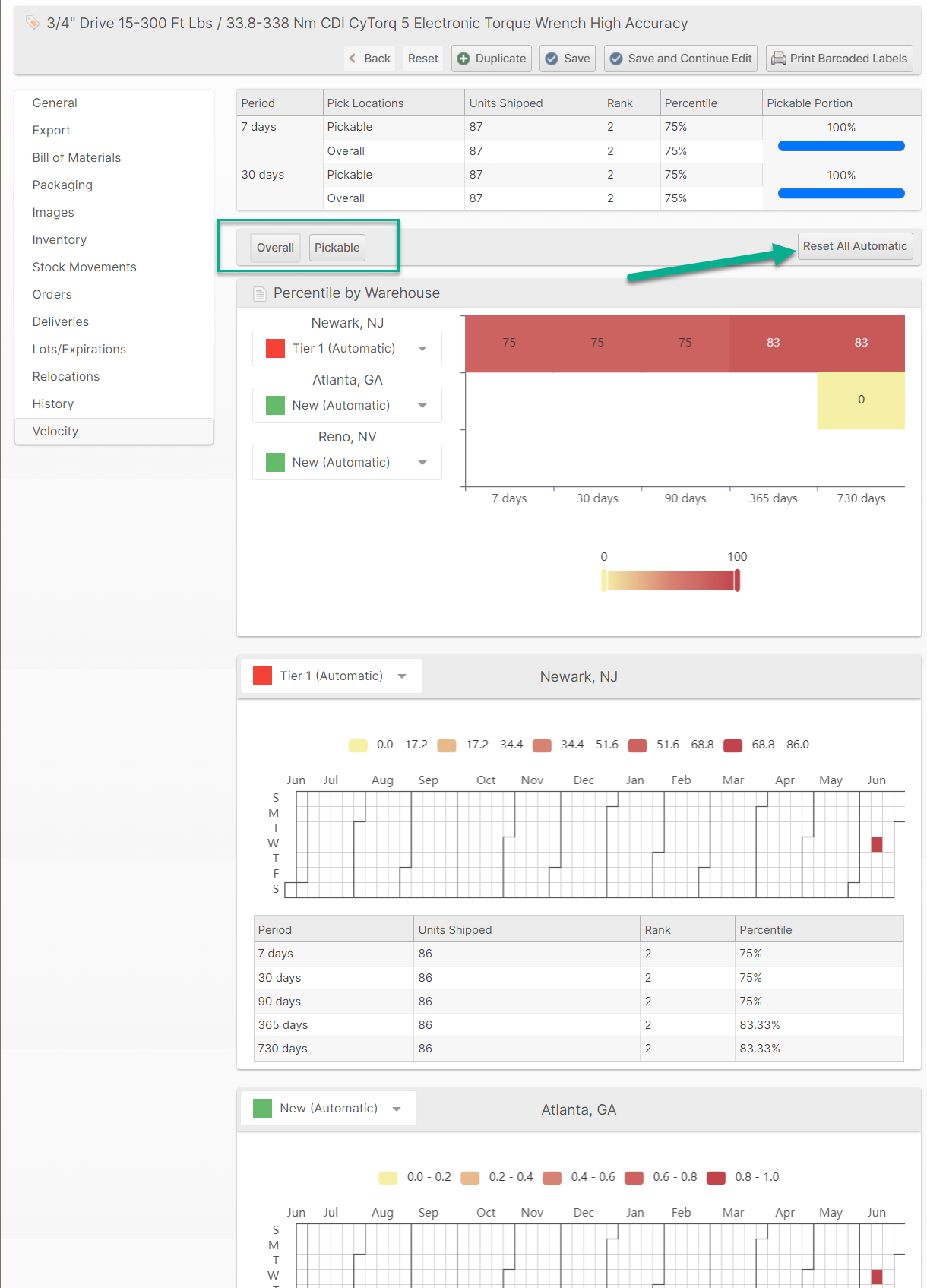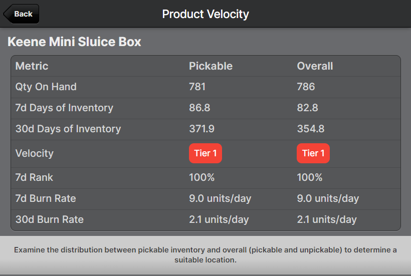 Relocating is also a great time to evaluate where your product should be ideally located, so you can see the Pickable velocity on the Relocation pages.