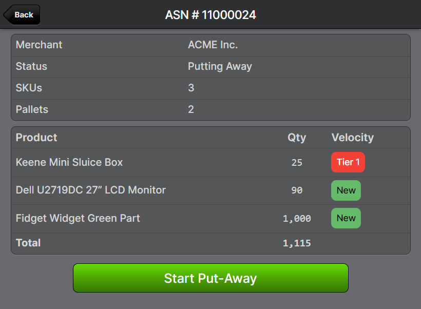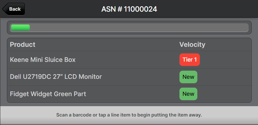 When starting a put-away, the velocities of each product are shown on the right side of the screen to give you an overview of the put-away importance as a whole.