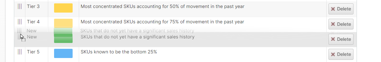 You may customize these according to your seasonality and how quickly you want your tiers to respond to changes. The longer the interval, the more "stable" your velocity rankings will be, and the shorter the interval the more quickly your velocity rankings will respond to changes. However, shorter intervals will also be more susceptible to wild swings from brief and unpredictable events.