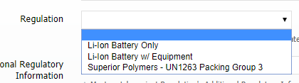 In many cases Lithium Batteries or items containing Lithium-Ion Batteries are allowed to ship to certain countries by ground or air without full hazmat regulation. When a product falls under a Lithium Battery exemption for dangerous goods you should assign the product to a Regulation with the "Lithium Batteries (IATA Section II)" exception type.