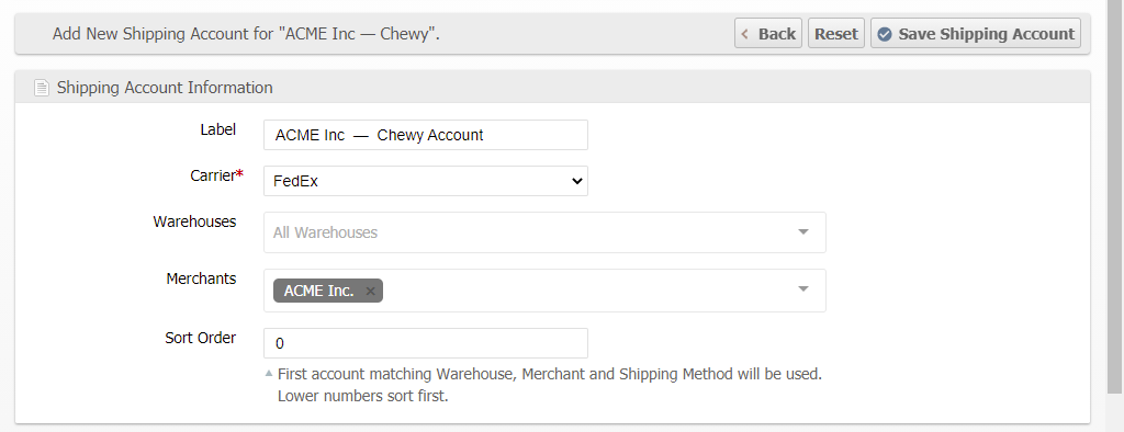 - Add a label to name the Shipping Account — "ACME Inc — Chewy Account"