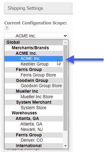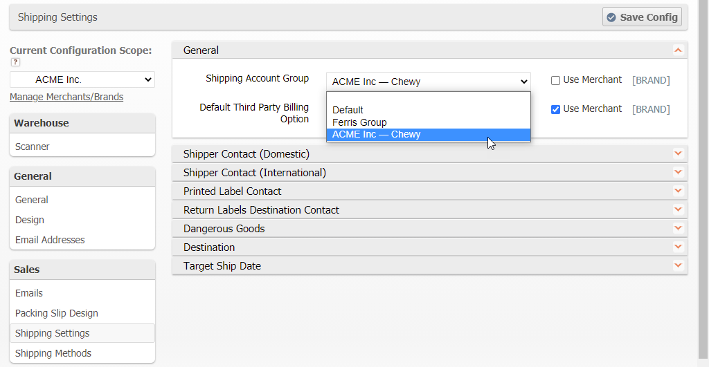 - Select the Brand scope that needs the specific Shipping Account — "ACME Inc — Chewy"