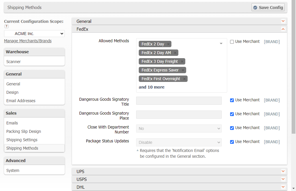 - On any Carriers that will be used configure the Allowed Methods that will be allowed for this Brand to use.