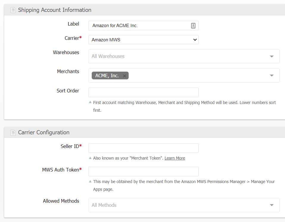 Since the Amazon MWS Credentials only provide access to the specific merchant who obtained them you will need to setup a separate Shipping Account in ShipStream for each Amazon seller. See Shipping Account Groups for more information on managing Shipping Accounts in ShipStream.