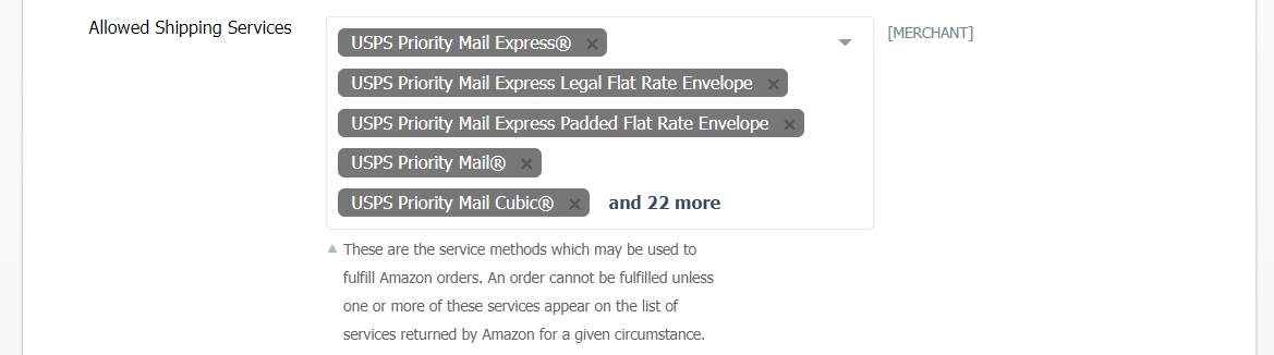In this case the shipment cannot be completed via the Amazon API until the configuration is updated to allow an eligible service to be selected. Alternatively, the shipment will have to be completed offline or using a non-Amazon shipping method and it will be up to the user to make sure the tracking number is relayed back to Amazon.