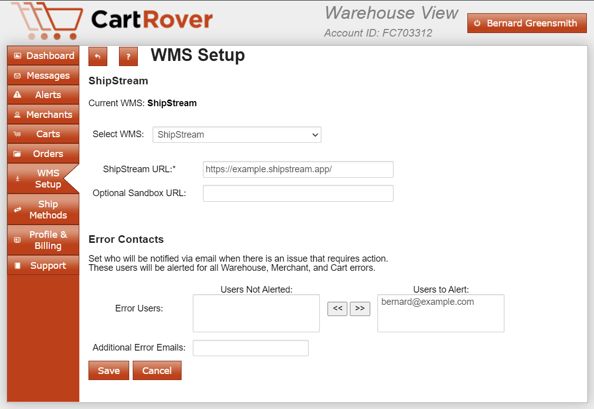 https://example.shipstream.app/ - Add one or more appropriate Error Contacts. Receiving these errors is important in the event that there is an error transmitting data to or from ShipStream.