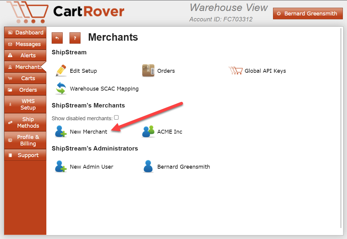 - Click New Merchant in the "ShipStream's Merchants" section.