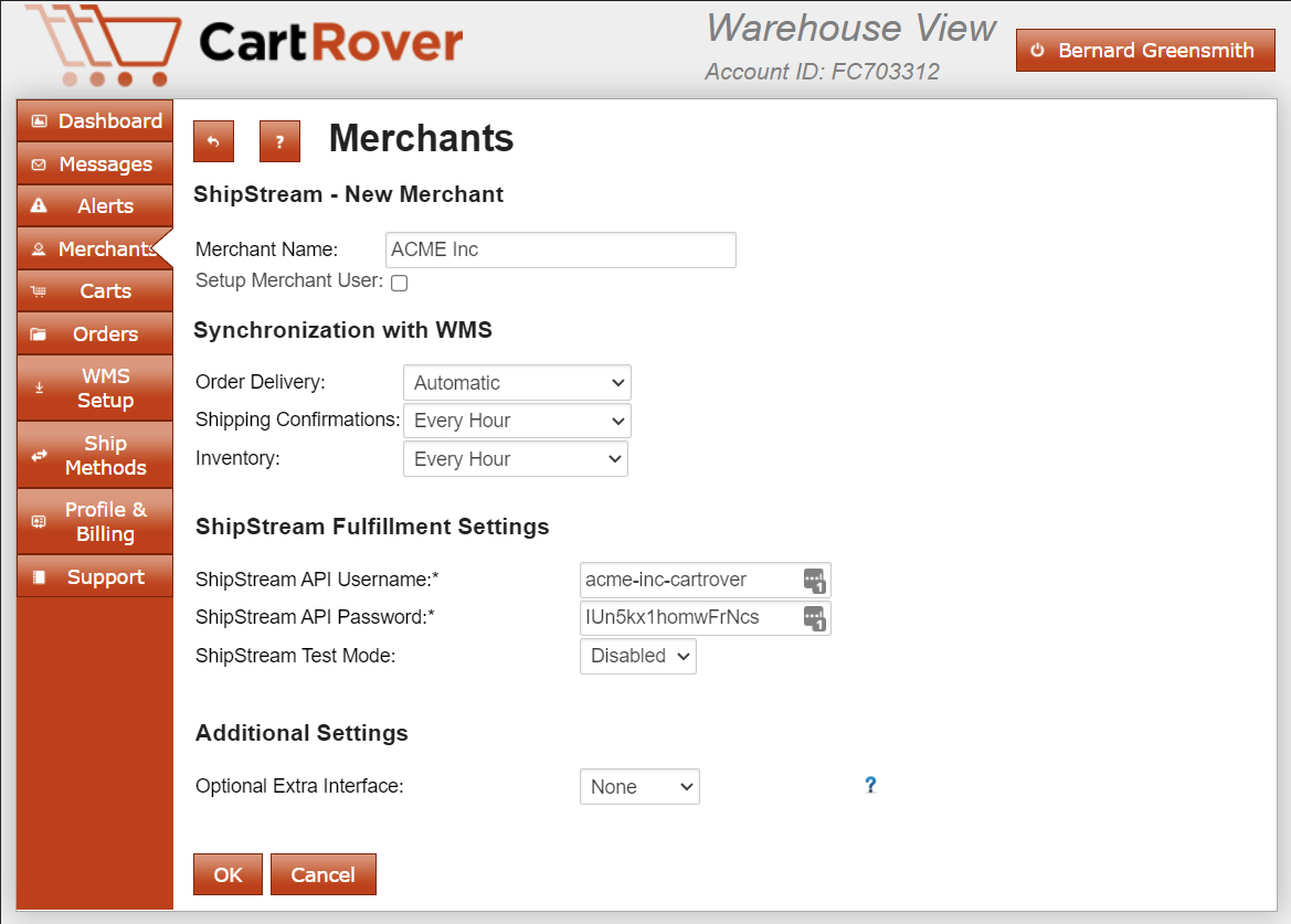After completing the WMS Setup once, you can add any number of Merchants to CartRover. These typically will correspond one-to-one with Merchants within ShipStream.