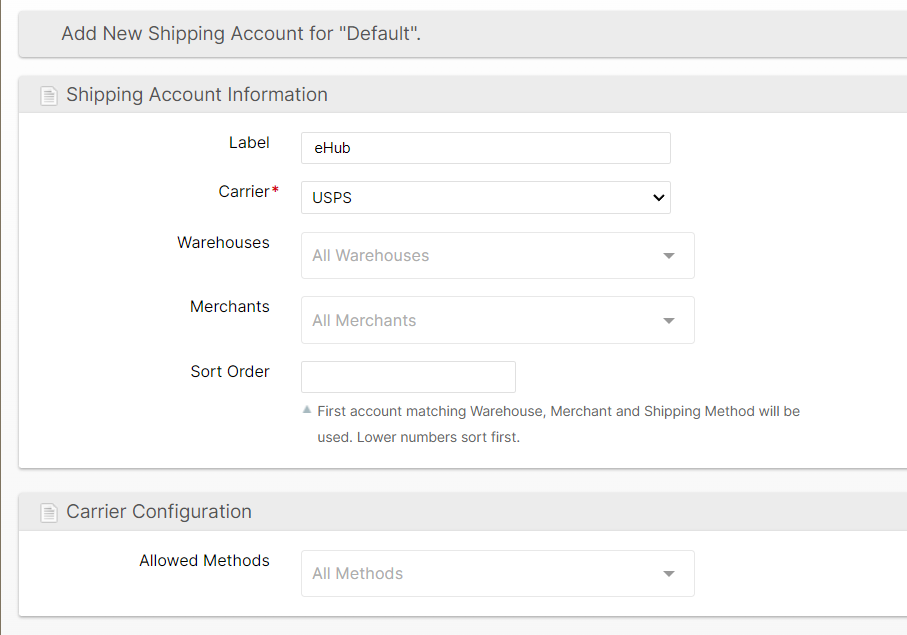 - Select the Carrier corresponding to the account you wish to add (e.g. USPS)