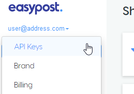 - Log In to EasyPost account dashboard, click your user name below the logo, and click API Keys.