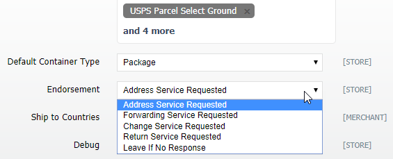 To set the Endorsement options navigate to System > Configuration and click the Shipping Methods tab in the left side menu. Scroll to the USPS pane and expand it. Choose the Endorsement method in the selection menu.
