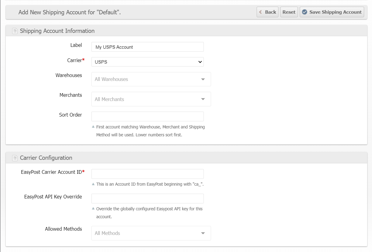 - In the last pane titled "Carrier Configuration," paste the Account ID from EasyPost into the EasyPost Carrier Account ID input and click Save Shipping Account.