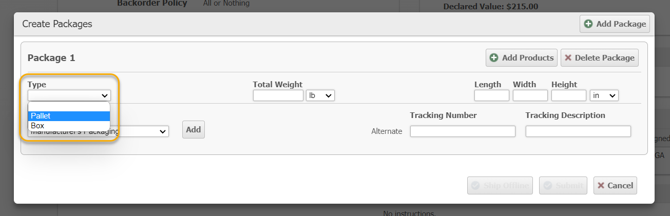 You may also specify the "Packaging" for each "Package' of the shipment by creating the appropriate Packaging Features beforehand and choosing them in the Pack and Ship dialog and clicking "Add" or by scanning their barcode in the Scanner UI. When creating the Packaging Features choose Container as the type and select either "Rigid Box" or "Pallet" as the Container Style, which will help determine the type as Pallet or Box for Freight Club when booking the shipment with Freight Club.