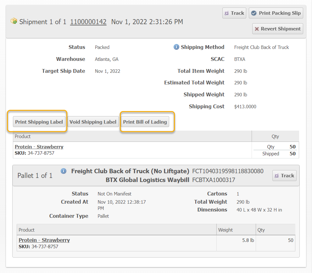 The Bill of Lading will also be sent directly to the laser printer if one is selected, or it can be downloaded by clicking Print Bill of Lading.