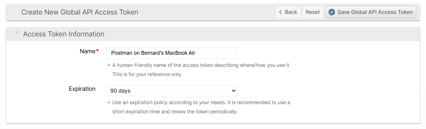 - Provide a name for this specific token for future reference and choose an appropriate Expiration policy.
