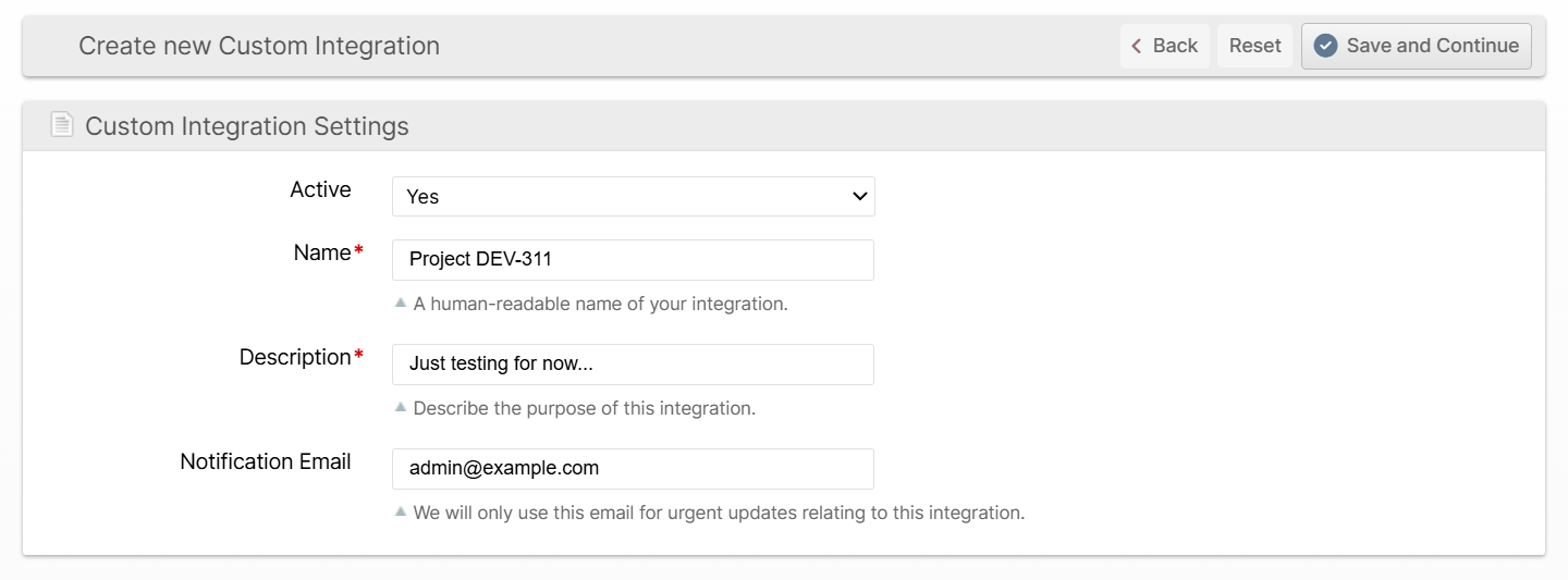 It is recommended to create separate integrations for apps with different modes of access or especially apps managed by different teams.- Fill out the form, providing the Name, Descrioption and Notification Email.