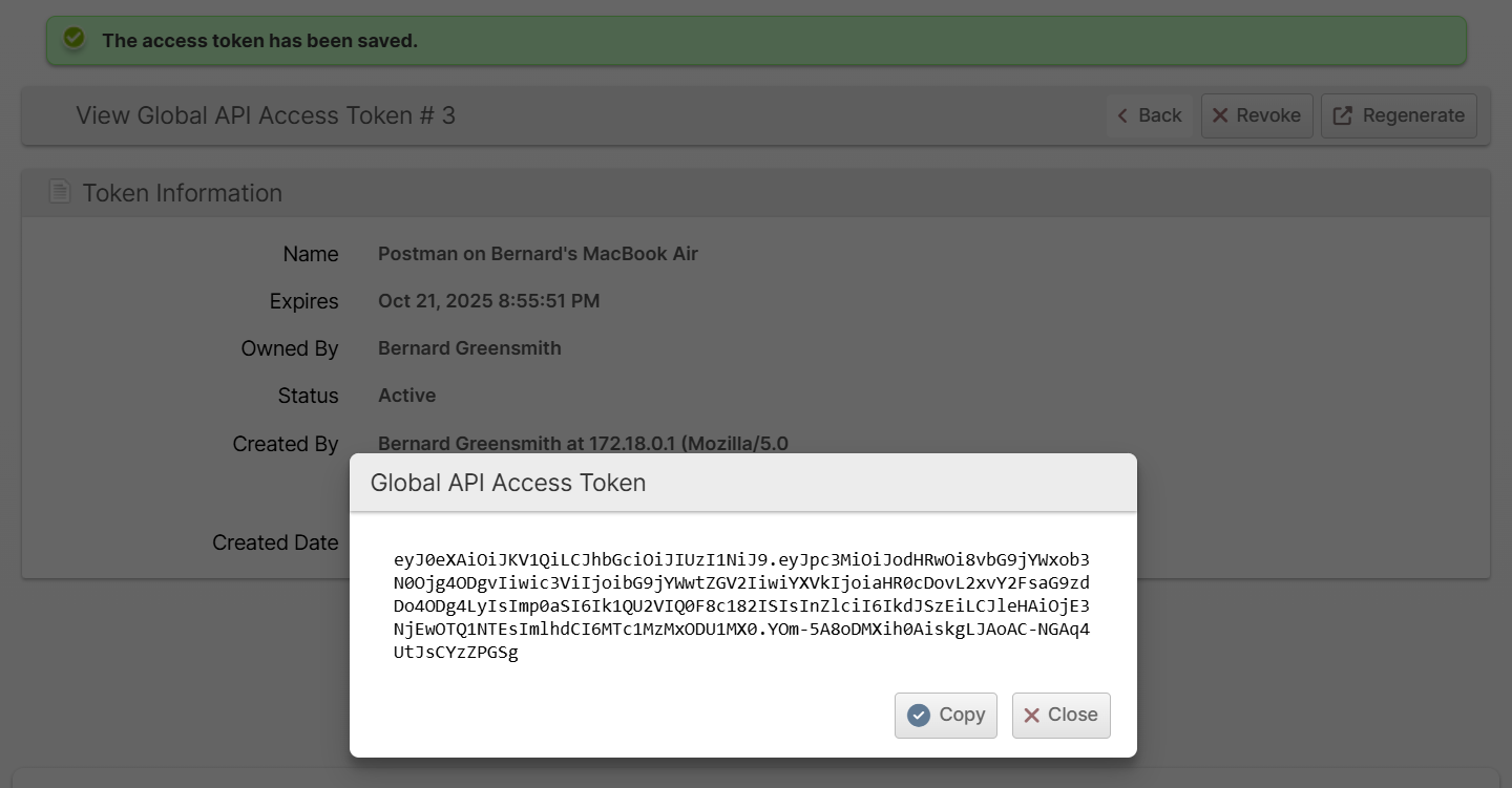 - Click Save Global API Access Token and then Copy to copy it to your clipboard.