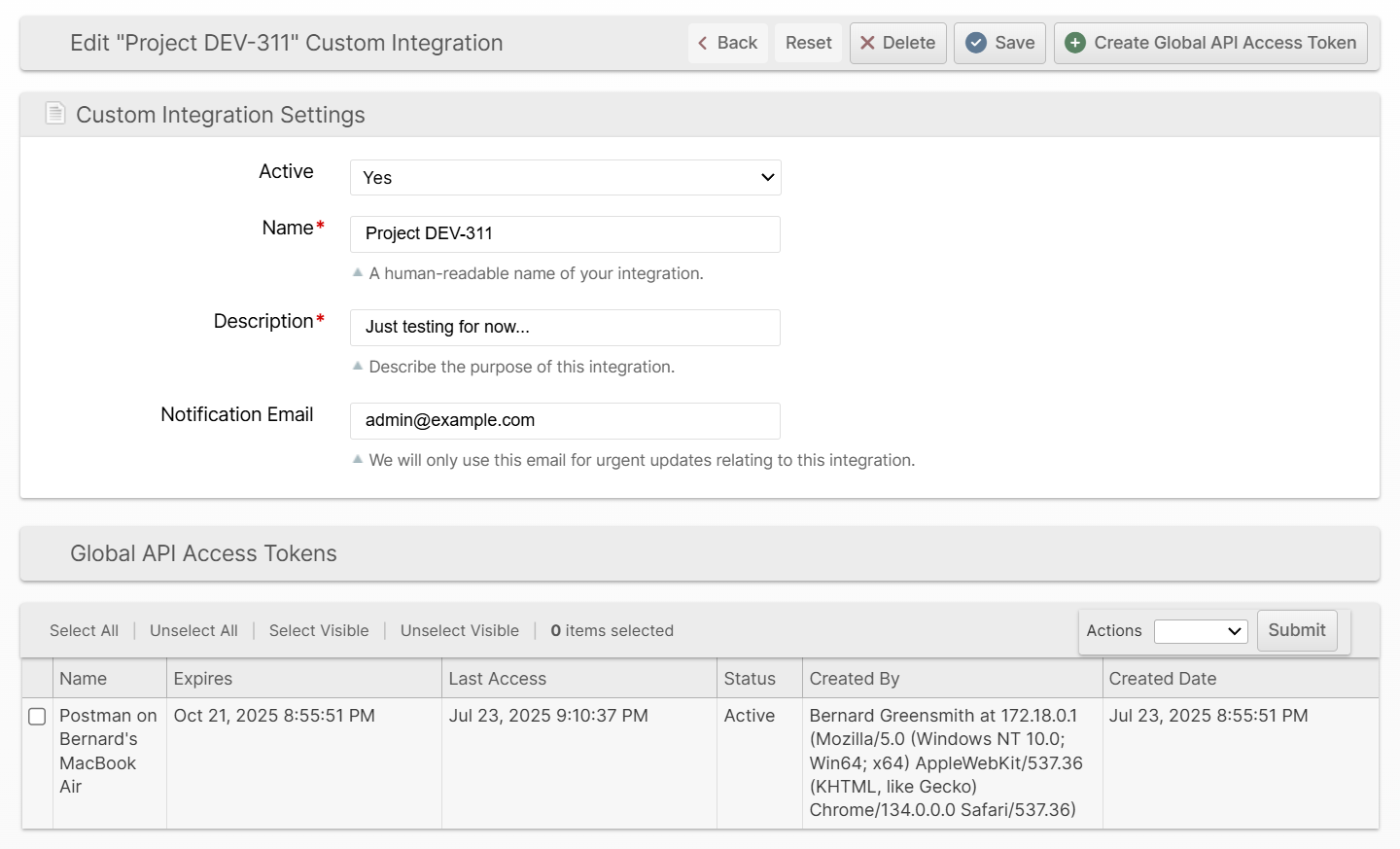- Edit the Custom Integration and change the Active field to No. This can be reversed by changing it back to Yes.