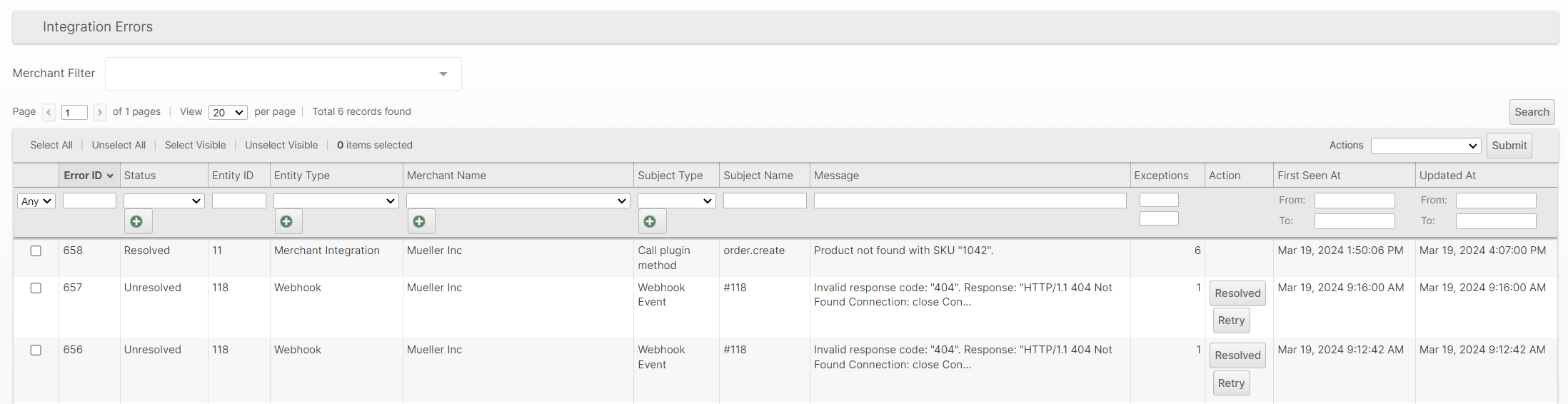 Integration errors are typically associated with a specific integration instance (Entity Type and Entity ID) as well as a specific "subject" which is for example an Order or Webhook. Errors specific to a Merchant Integration or Webhook assigned to a merchant can be filtered by the Merchant Name.