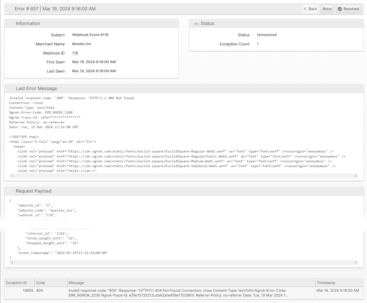 If you can determine the cause of the issue, have addressed it, and are ready for the system to retry the action that generated the error you can click Retry to immediately have the system try again. Errors that are successfully retried, either automatically or manually are automatically marked as Resolved. If the error is somehow resolved externally (for example, an order with invalid data was canceled) you can simply click Resolved to mark it resolved as well.