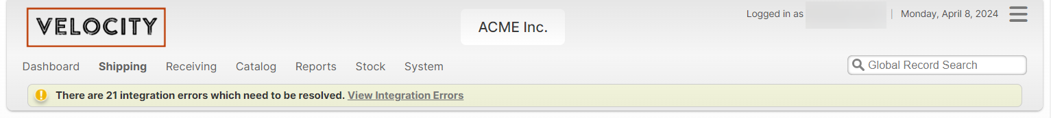 When there are unresolved errors, client users with permission to view integration errors will see a notice in the page header alerting them to the fact that there are unresolved errors.