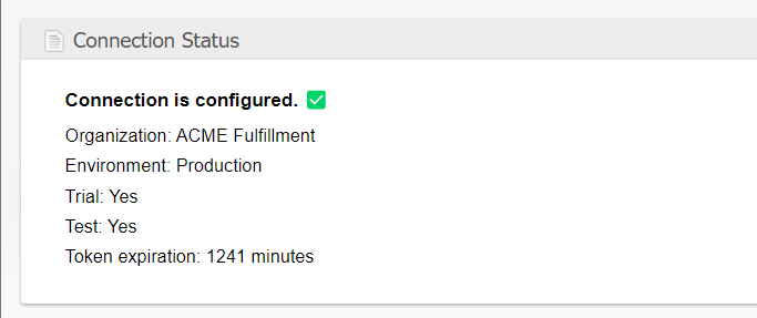 - When you are returned to the ShipStream page for the SPS Commerce integration you should see your company name as designated by SPS Commerce listed in the Connection Status after "Organization".
