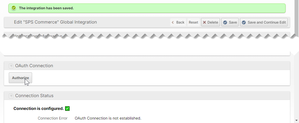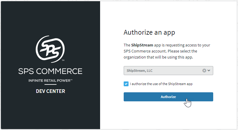 - Click the Authorize button and complete the authorization with your SPS Commerce account.
