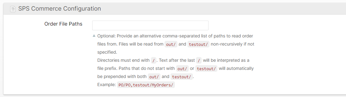 By default, ShipStream will read order files from the out/ and testout/ directories of the SPS Commerce server. Subdirectories are ignored by default, so if you need to read files from a different directory or only with specific prefixes, these must be specified here. For example, a configuration of PO/PO,testout/MyOrders/ would cause ShipStream to only read files matching these paths and ignore all others: