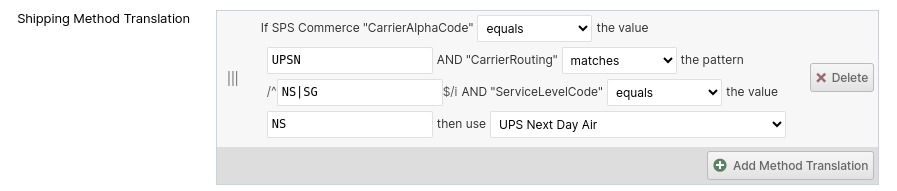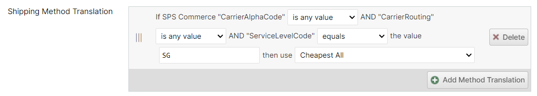 As every order must have a Shipping Method assigned, the integration will make it's best effort to map the incoming CarrierAlphaCode and ServiceLevelCode fields to the closest matching Shipping Method. But, you may override this and specify a Shipping Method Translation to map the CarrierAlphaCode, CarrierRouting and ServiceLevelCode values coming from SPS Commerce to the ShipStream Shipping Method of your choice.
