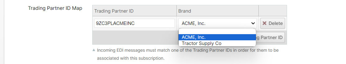 Add a row for each Trading Partner ID for which you will be receiving orders and select the appropriate Brand for each.