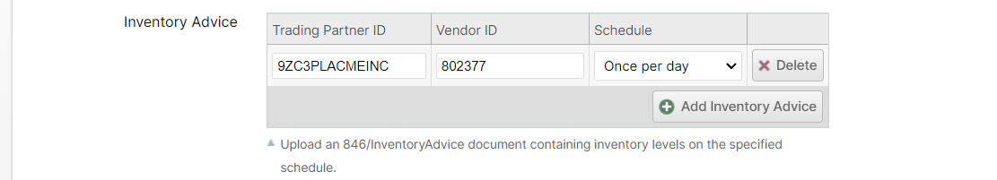To report your inventory levels to your trading partners you will simply need to add an Inventory Advice configuration for each Trading Partner which is entered in the first field, and the time interval selected for that Trading Partner in the second field.