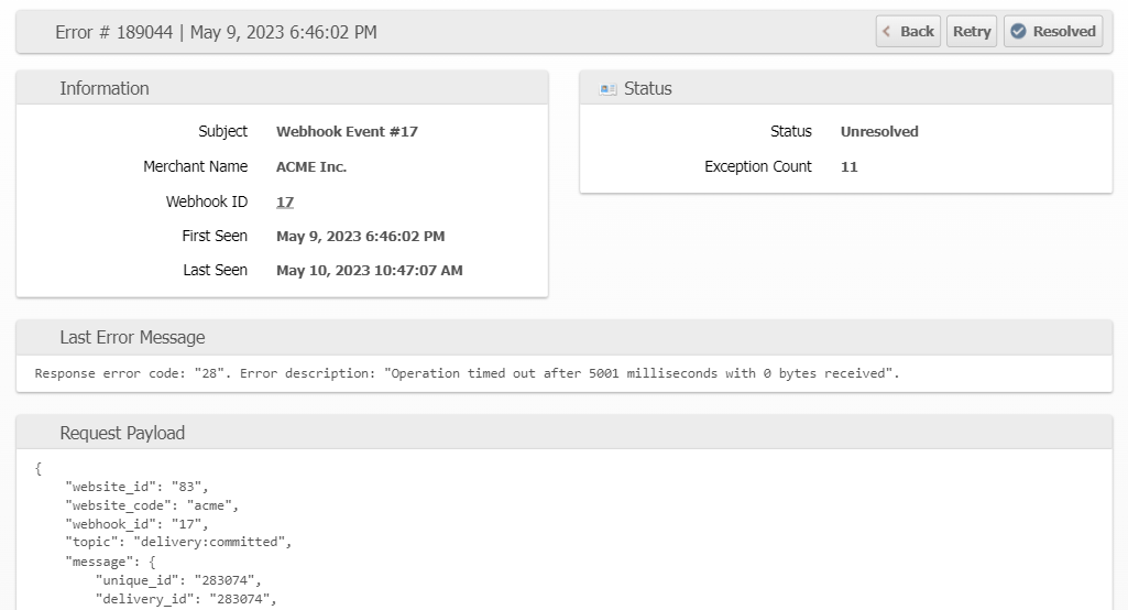 If the webhook succeeds on a retry, the error is automatically marked as Resolved so the alert automatically disappears when there are no unresolved errors.