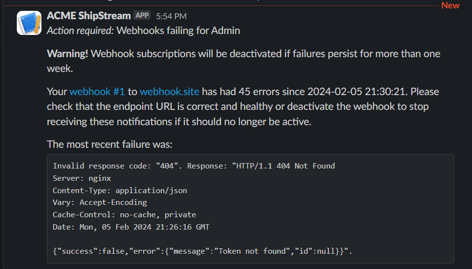 When ShipStream sends an HTTP request for a webhook event, the request is only considered a "success" if the receiving application responds with a 200 response code. This ensures that if there was a network issue or your application somehow missed the webhook or was unable to process it, the webhook will be attempted again. ShipStream will make many attempts to retry the webhook so if there is any temporary outage of your application, there will be no data loss as all failed webhooks will be retried automatically.