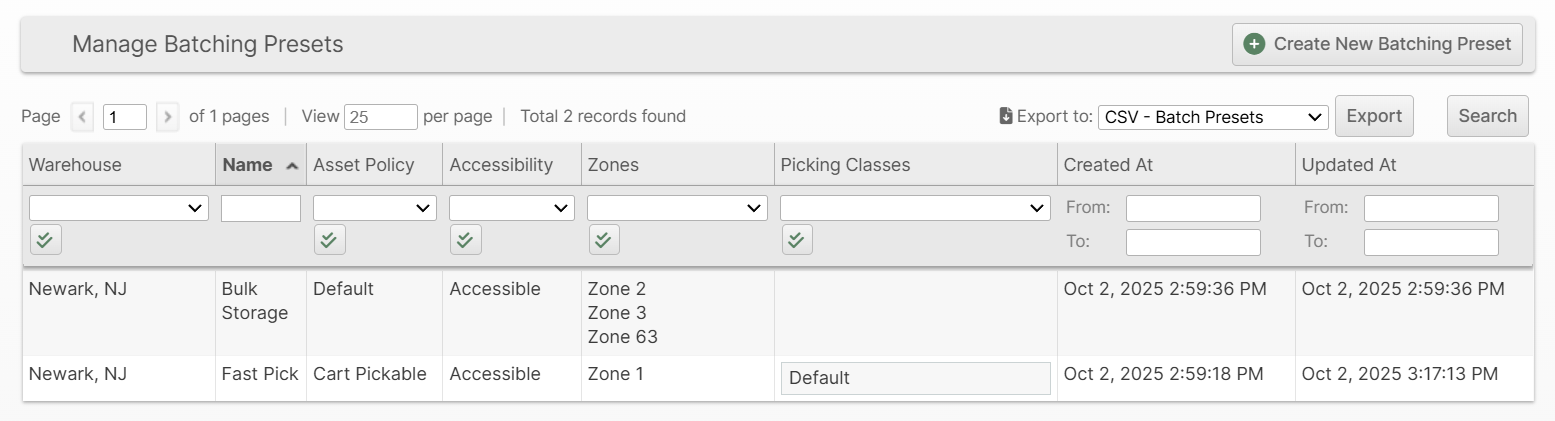 Batching Presets build on the foundation of Picking Classes, Asset Types, Asset Policies and Zones to simplify the process of creating picking batches that fit your needs best. Using presets ensures consistency across personnel, over time, and reduces potential for human error or deviation from your established batching guidelines.
