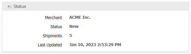 Displays the Merchant, Status, number of Shipments, and when it was last updated.